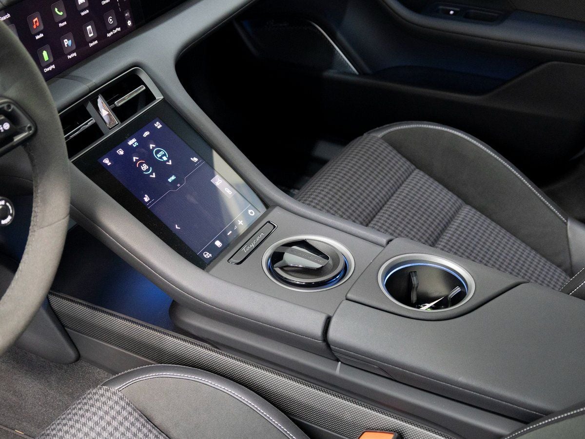 The Taycan 4S stands as a beacon of electrified performance and unmistakable Porsche design, its Dolomite Silver Metallic exterior reflecting both elegance and athleticism. Adorned with 20 Sport Aero Wheels wrapped in All-Season Tires and accented by Wheel Center Caps with Colored Porsche Crest, it presents a purposeful stance. The SportDesign Front Fascia and SportDesign Side Skirts sharpen its dynamic profile, while Window Trim and Model Designation with electric Logo in High Gloss Black add a sleek, modern edge. HD-Matrix Design LED Headlights and a Light Strip with Illuminated PORSCHE Logo complete its striking presence.