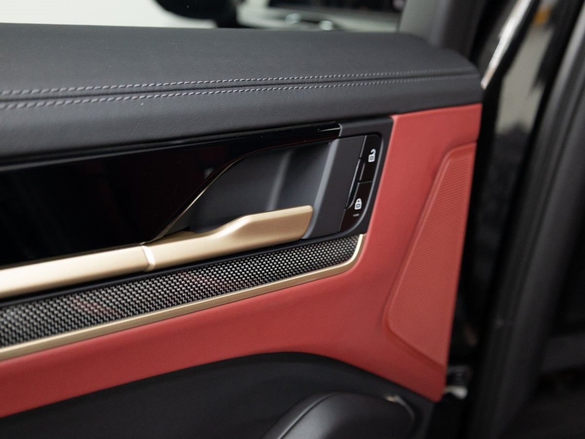 The cabin greets you with a bold Black/Bordeaux Red leather interior, detailed with Interior Trim and Accents in Neodyme and Carbon Fiber for a motorsport-inspired ambiance. 14-way Power Seats with Comfort Memory, Ventilated Front Seats, and Heated Rear Seats ensure every occupant enjoys the ride. A Heated Windshield adds convenience in colder months, while the Compass Display in the Sport Chrono Package speaks to its adventurous spirit. The Burmester 3D High-End Surround Sound System delivers top-tier audio precision for every journey.