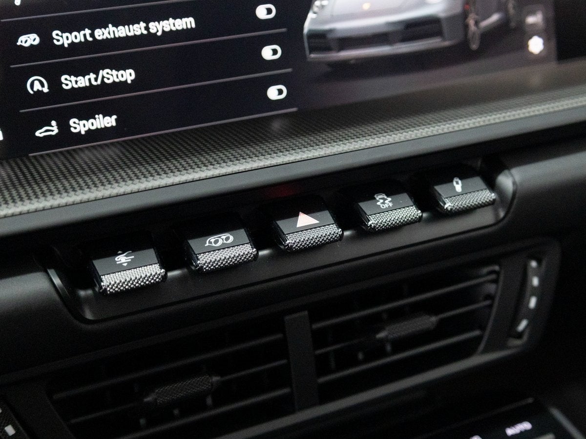 Step inside and the Club Leather Interior in Basalt Black envelops you in a cockpit designed around the driver. Adaptive Sport Seats Plus (18-way) with Memory Package provide exceptional support, complemented by Ventilated Front Seats for added comfort. Matte Carbon Fiber interior trim, the Heated GT Sport Steering Wheel with carbon trim, and the Sport Chrono Stopwatch and Digital Tachometer in White add motorsport-inspired elegance. Premium details such as the BOSE Surround Sound System, Roof Lining in Race-Tex, and Porsche Crest on the Front Headrests complete a cabin that is both luxurious and performance-driven.
